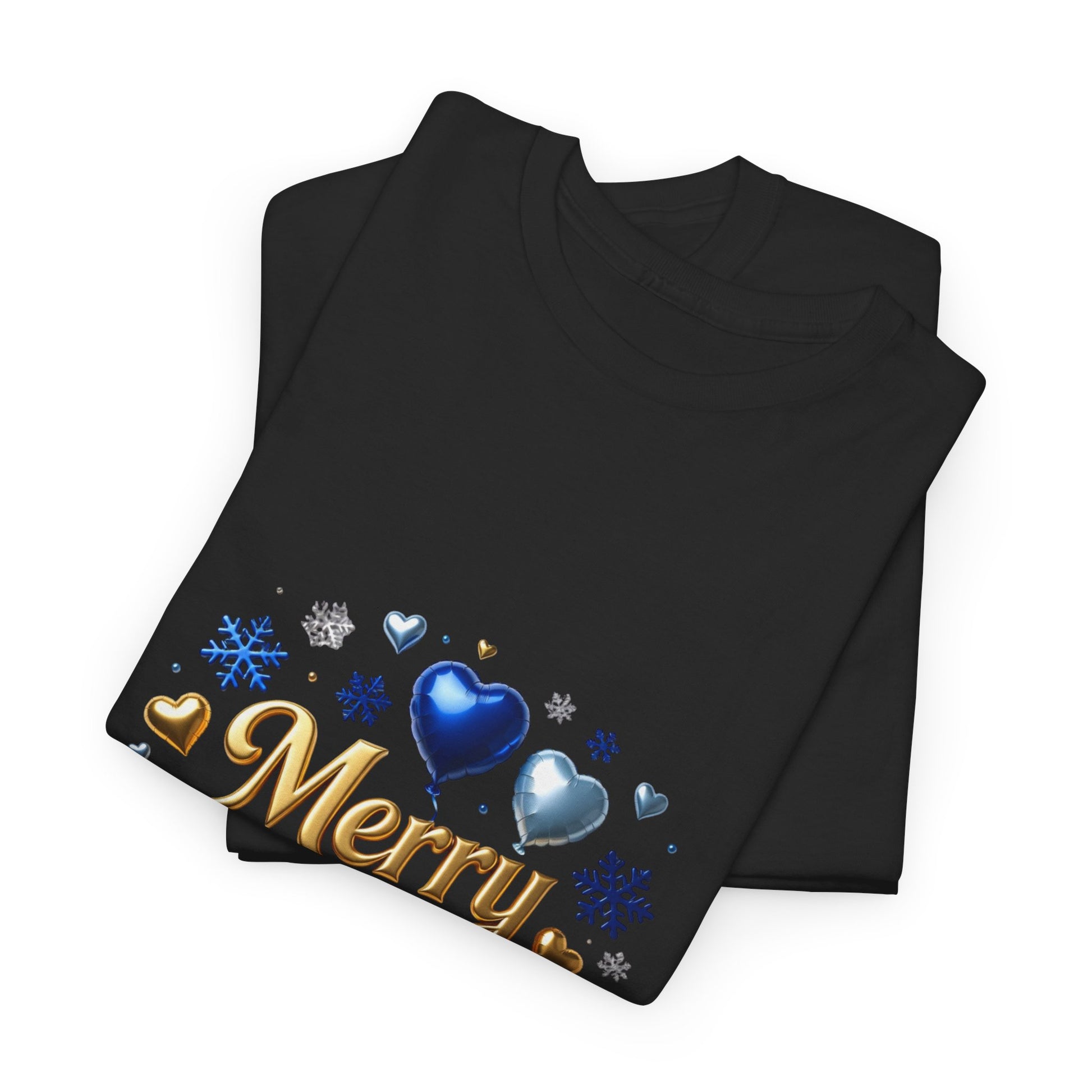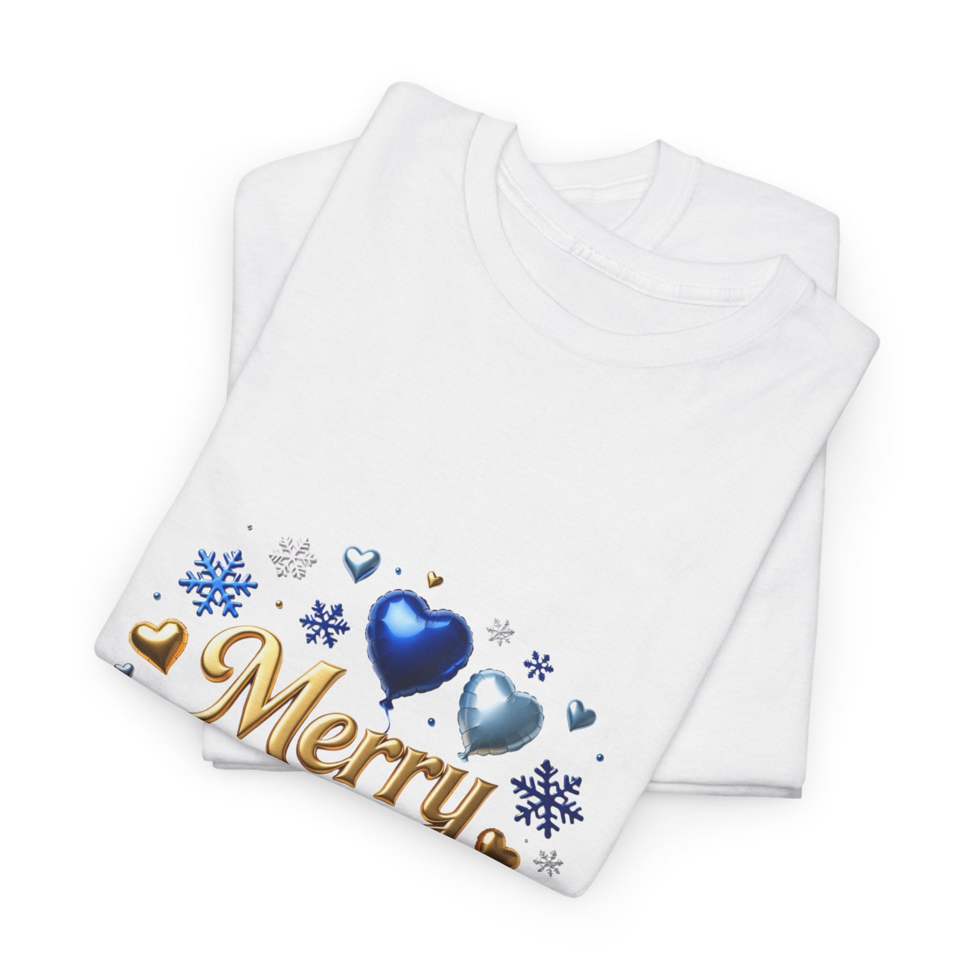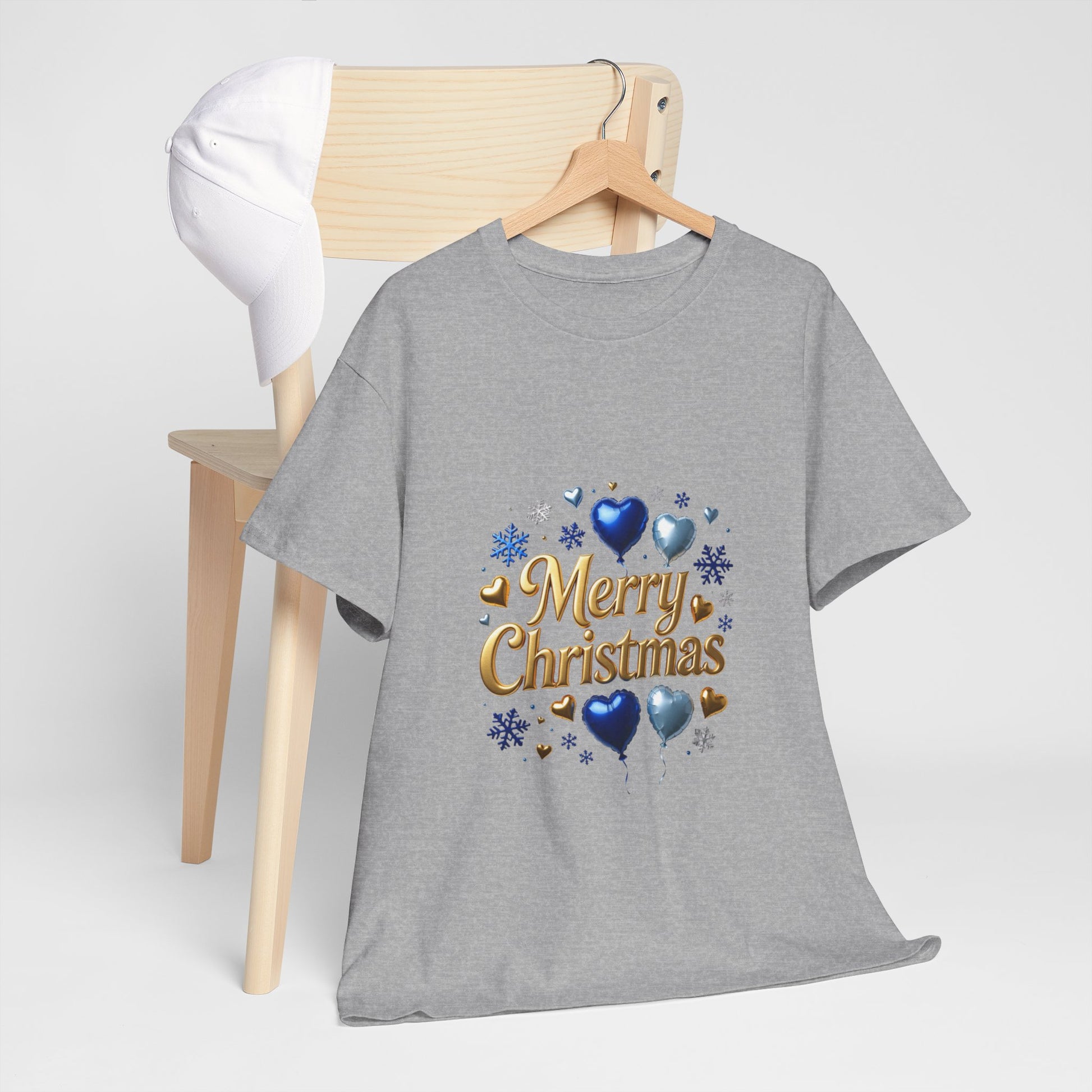 A soft, classic cotton tee that carries a quiet, cozy take on holiday cheer. Golden script spelling “Merry Christmas” sits surrounded by delicate snowflakes and deep blue heart balloons — a tasteful mix of warmth and winter calm. It feels like a snowy morning wrapped in a loved one’s sweater: gentle, familiar, and quietly celebratory. Wear it to low-key family gatherings, neighborhood carol nights, or while wrapping presents by lamplight. The relaxed cut and breathable fabric make it easy to layer under a cardigan or pair with jeans for drifting from kitchen to living room without missing a moment of holiday conversation.