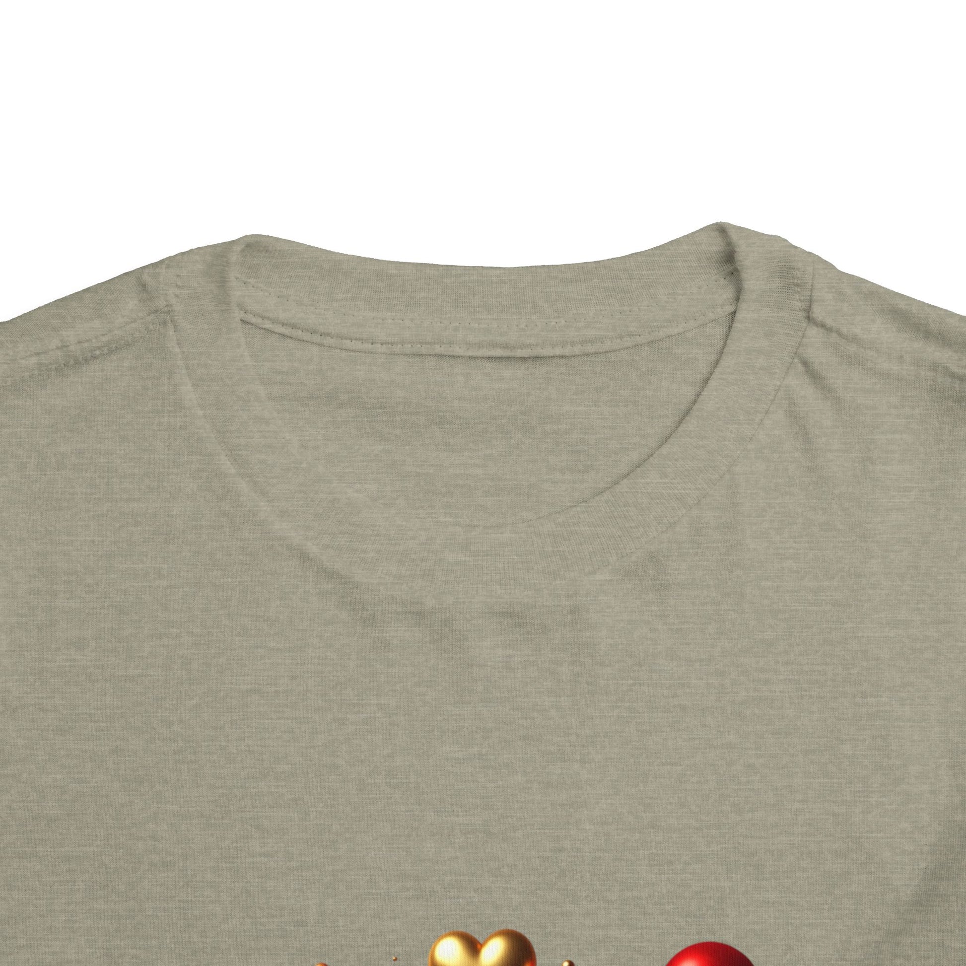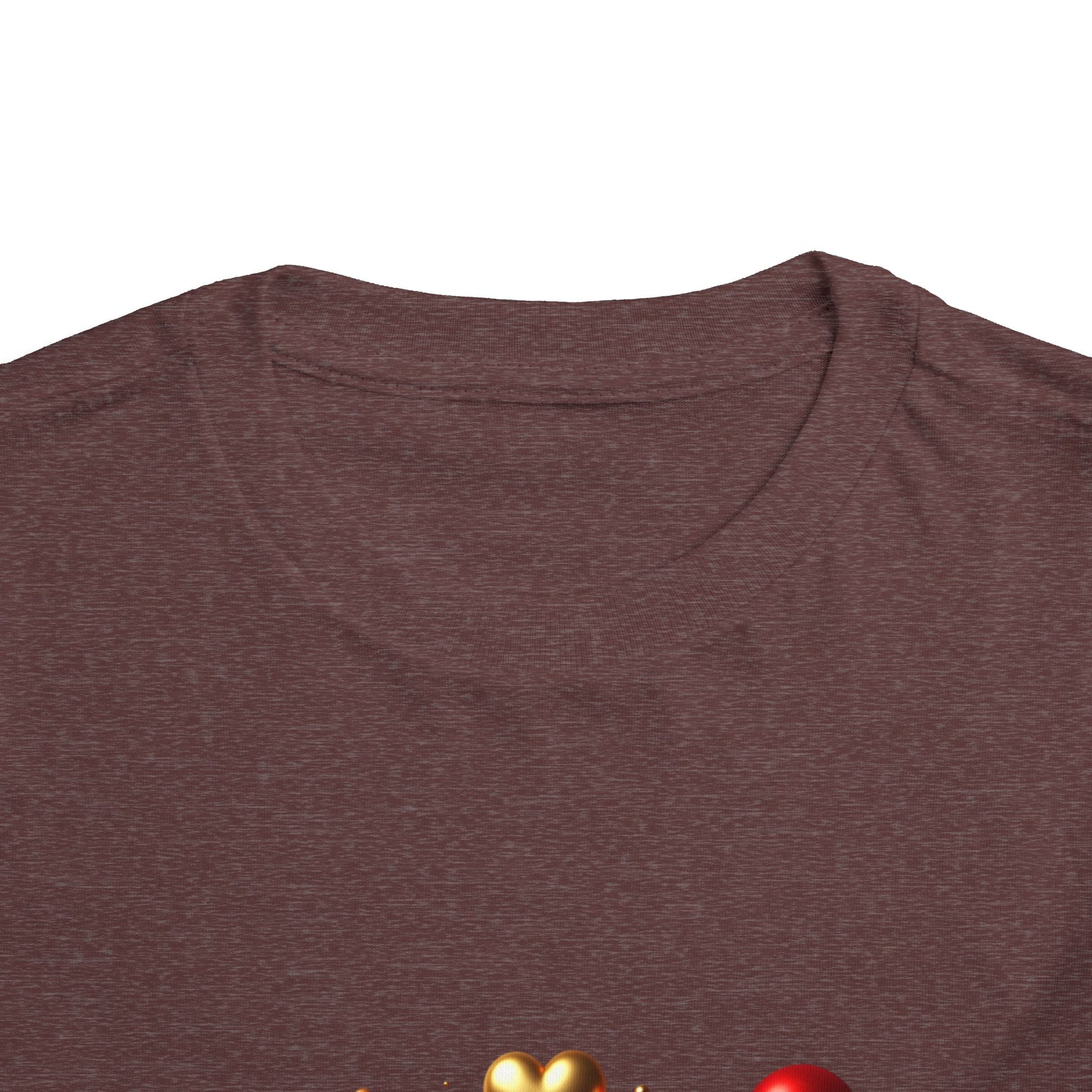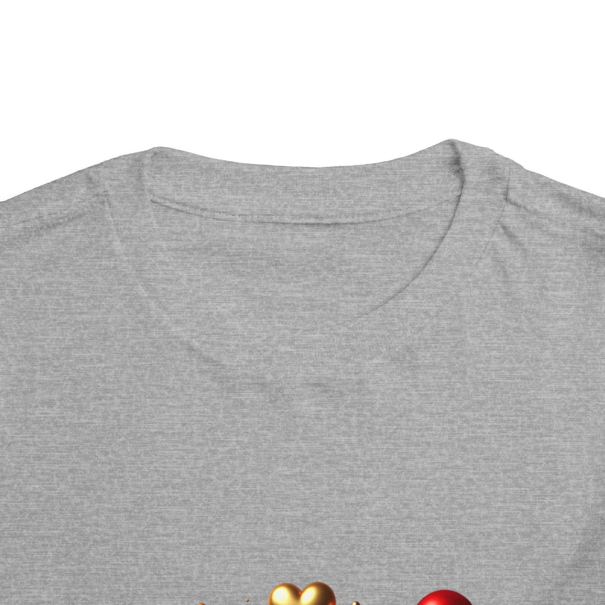 Soft, lightweight toddler tee with a cheerful holiday motif that feels cozy and easy to move in. The white tee showcases a warm “Merry Christmas” design with gold script, tiny hearts, a red balloon and a garland of poinsettias — a small, joyful splash of festive color at the center of the chest. Breathable airlume combed cotton and neat side seams keep the shape tidy through play, while the tear-away label prevents irritation. This shirt settles into everyday family moments: quiet mornings unwrapping stockings, cheerful visits with relatives, and lively living-room dance-offs by the tree. It’s designed for little ones who want to join the holiday fun without fuss — soft on skin, light enough for layering under sweaters or wearing on its own during seasonal gatherings.