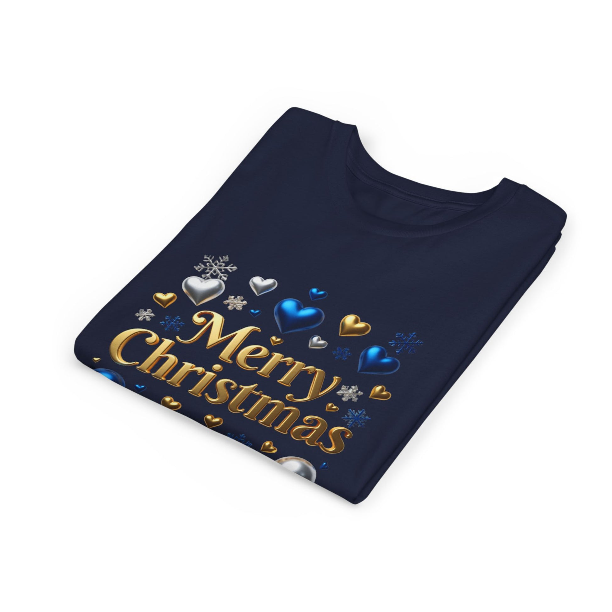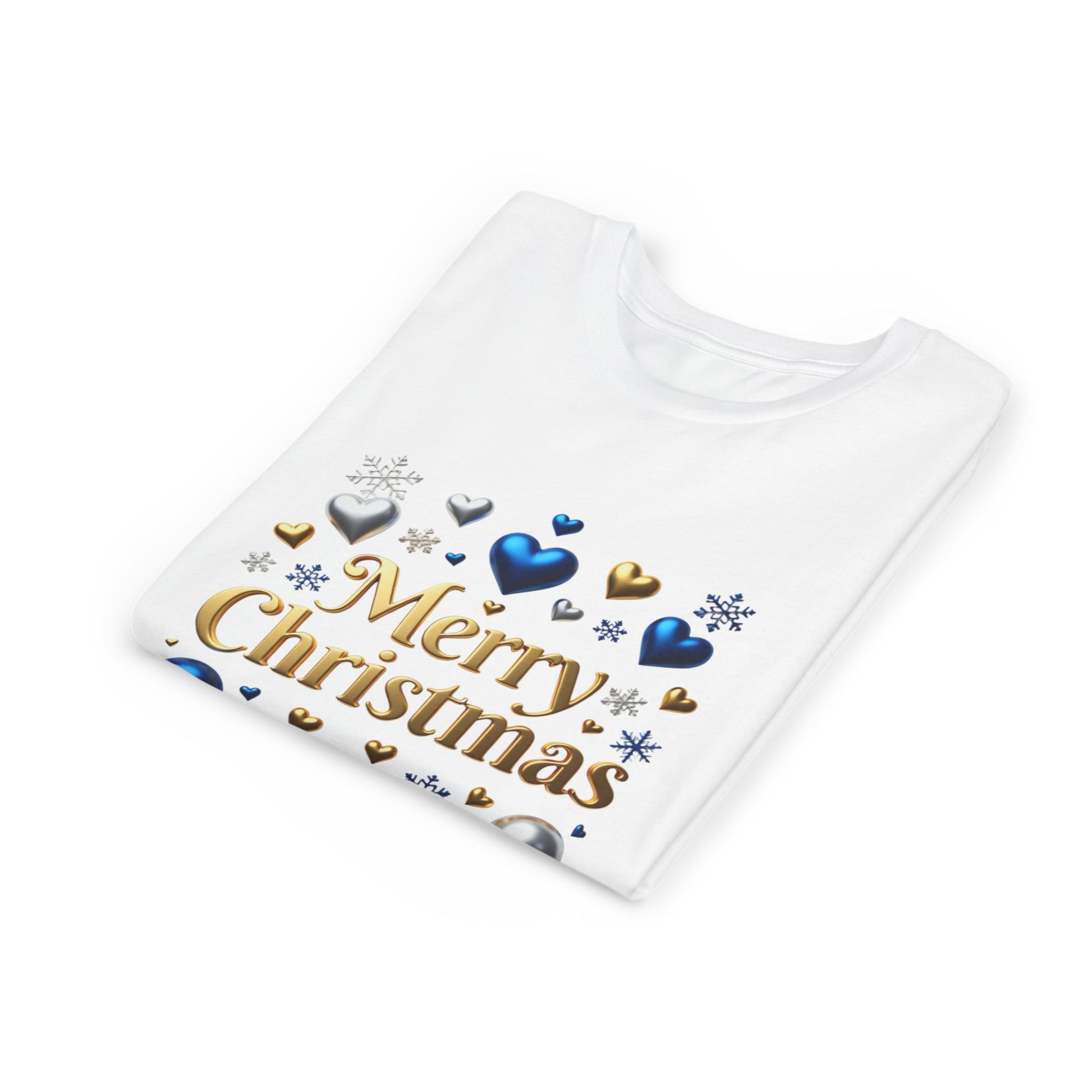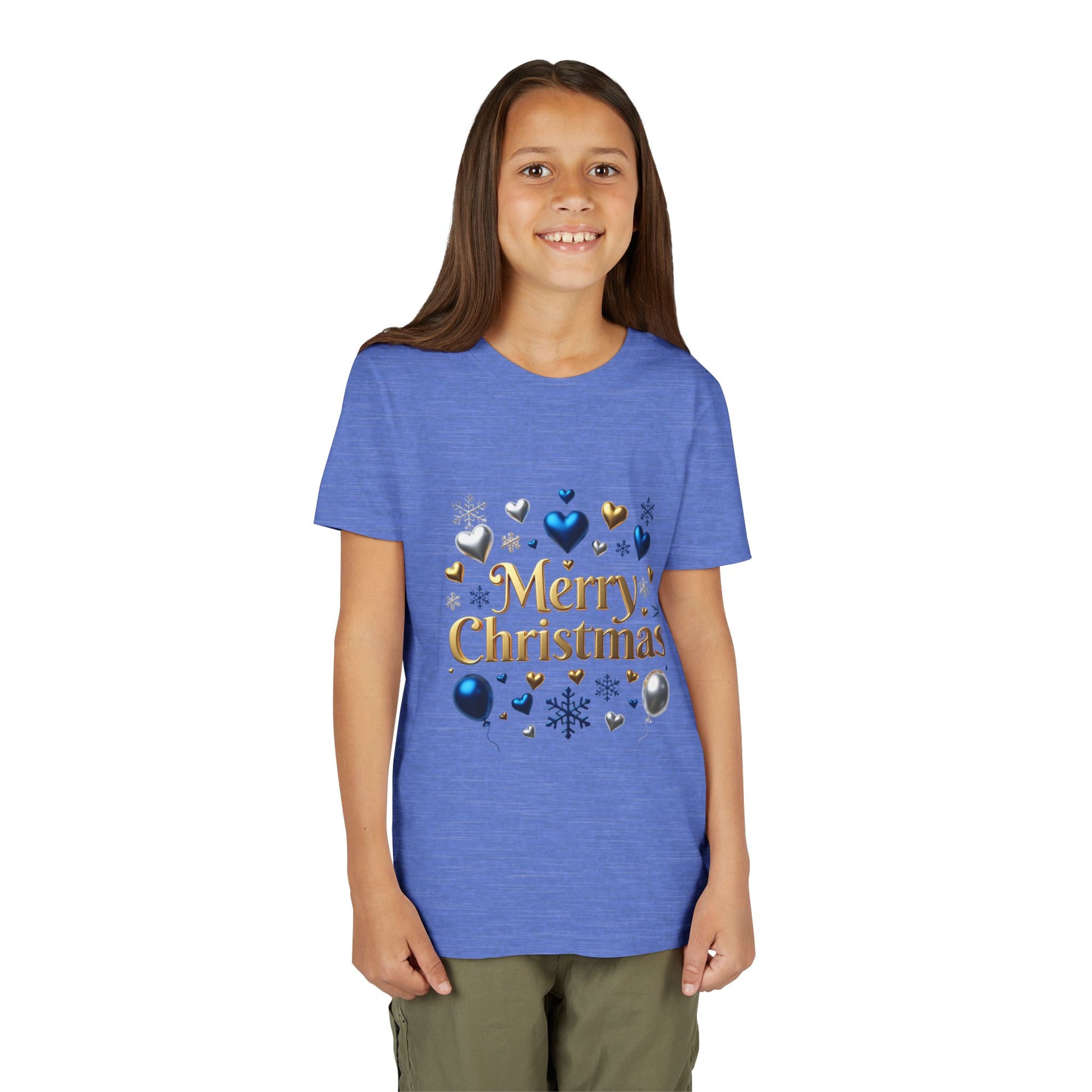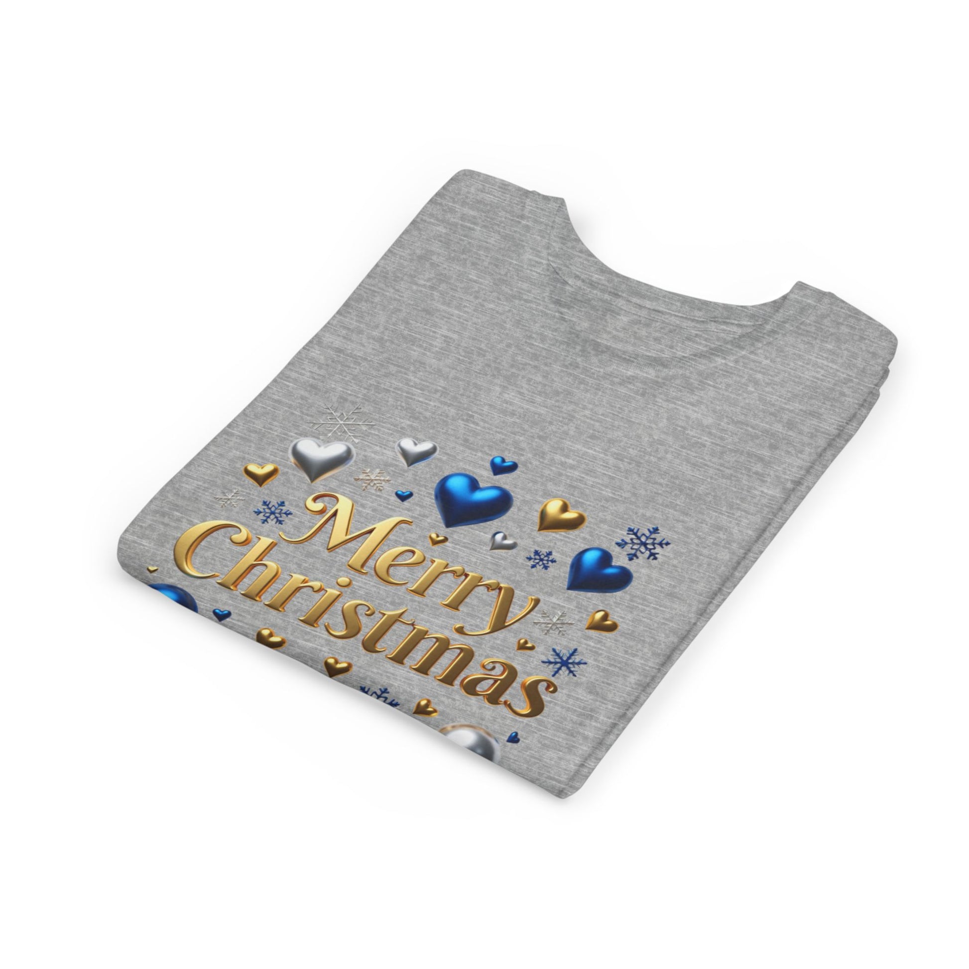 A soft, lightweight youth tee that brings a touch of holiday sparkle without feeling fussy. The clean crew neckline and retail fit let kids move freely while the gold “Merry Christmas” script sits among blue, silver, and gold hearts and snowflakes — playful and seasonal, not over the top. Breathable airlume-combed cotton keeps it cozy during school concerts, family photos, or afternoon cookie baking. Tear-away labels and reinforced shoulder tape mean no scratchy seams, and the ribbed collar holds its shape wash after wash. It’s a simple, joyful way for little ones to join in the celebration.