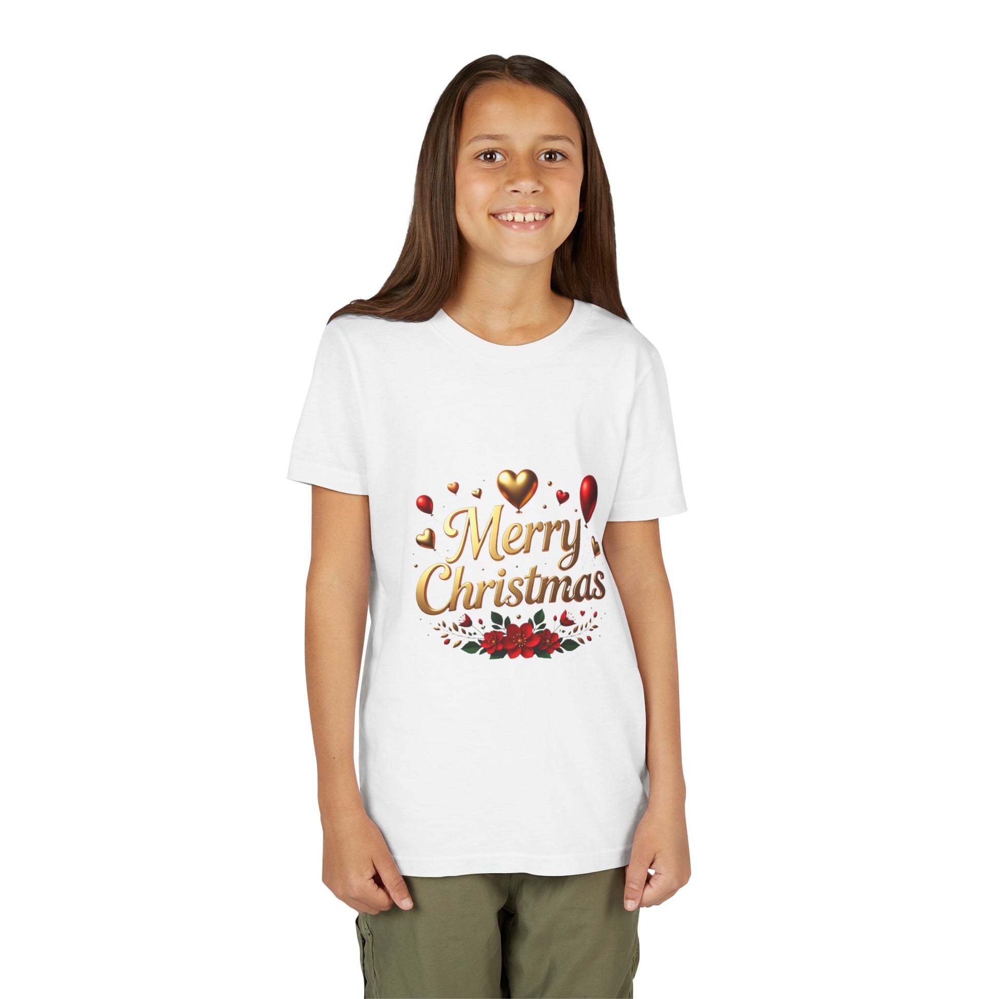 Youth Tee — Merry Christmas Gold Script with Hearts & Poinsettia Holiday Design